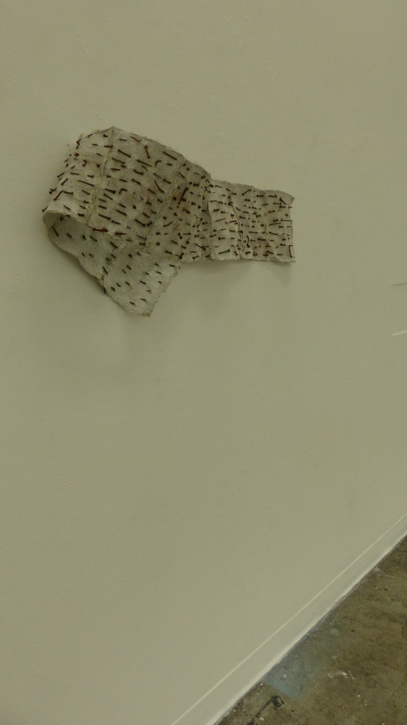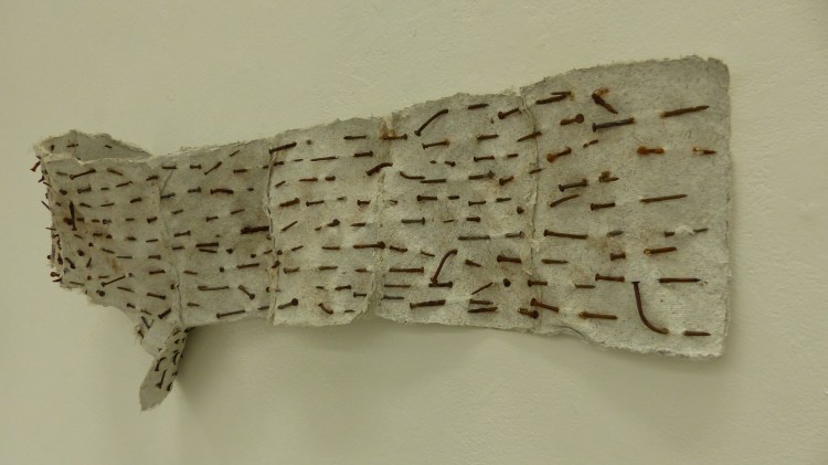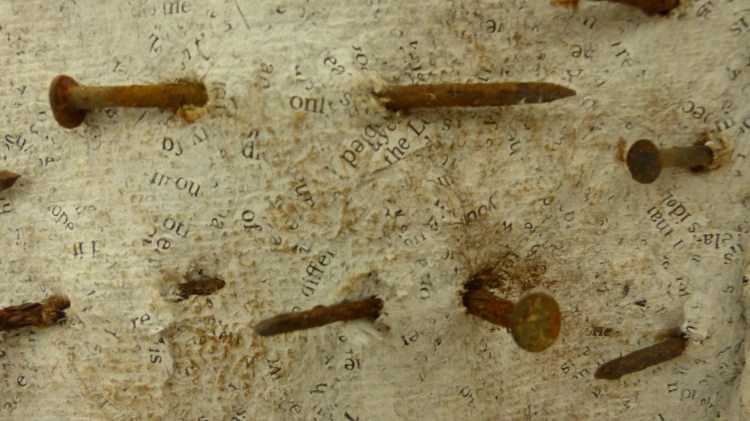 pulped bible on mesh, rusty nails, linen bookbinding thread