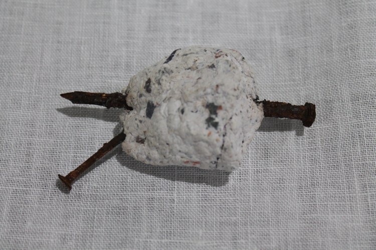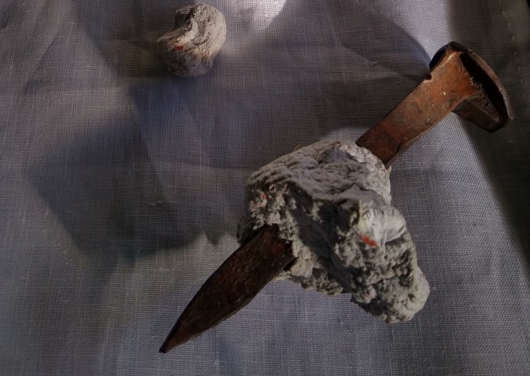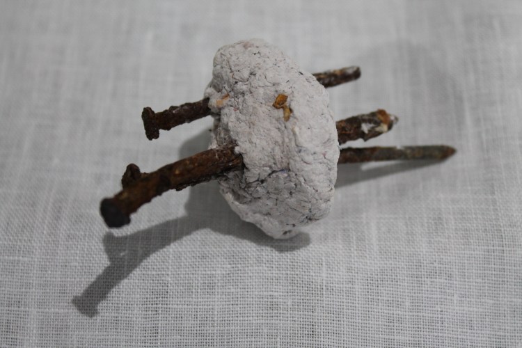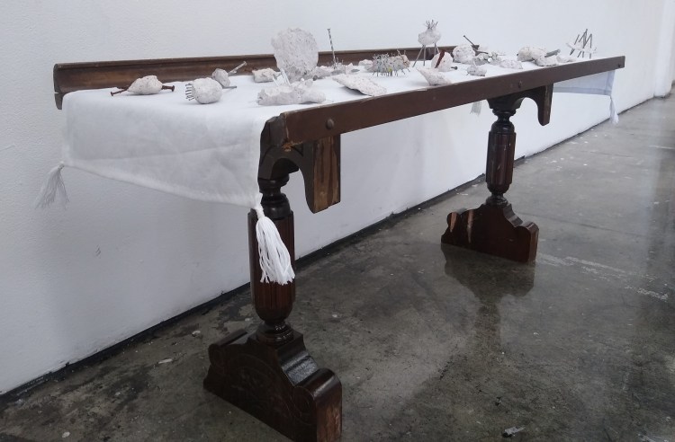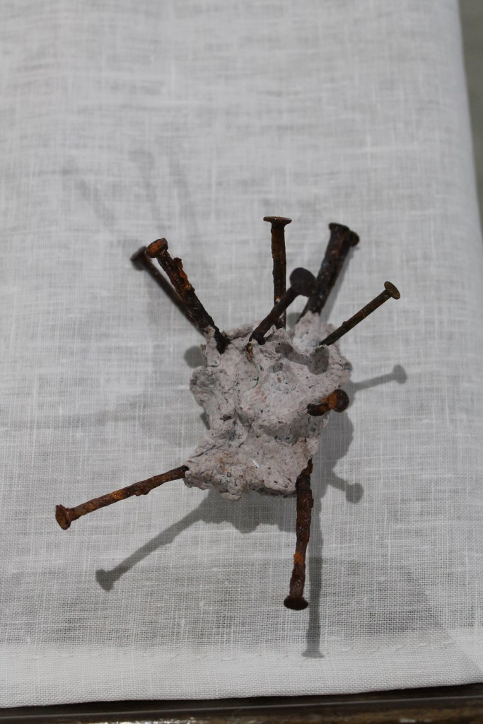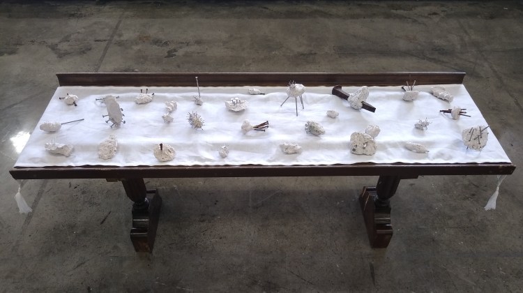 Altar, linen, nails, pulped bible.