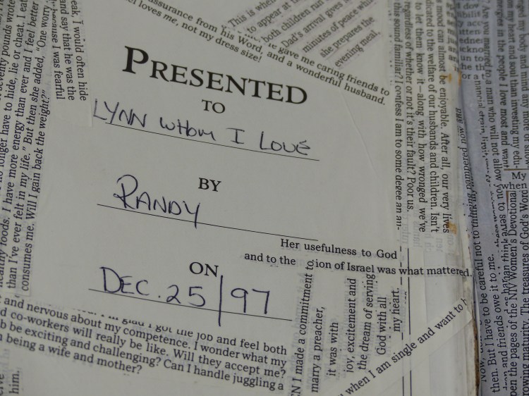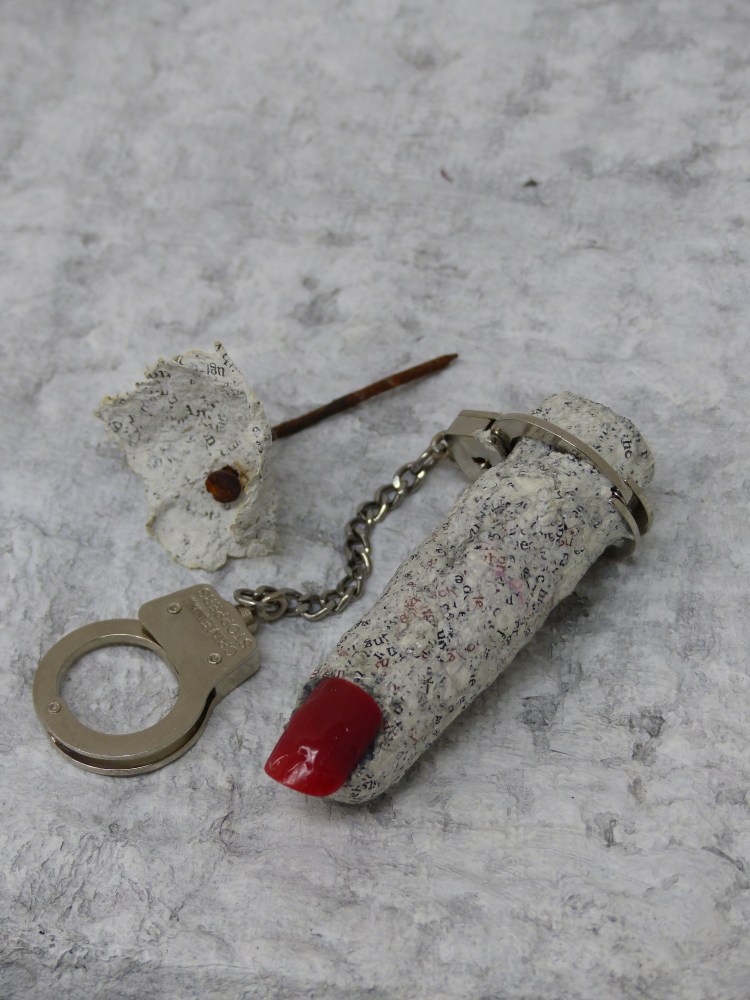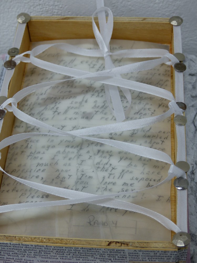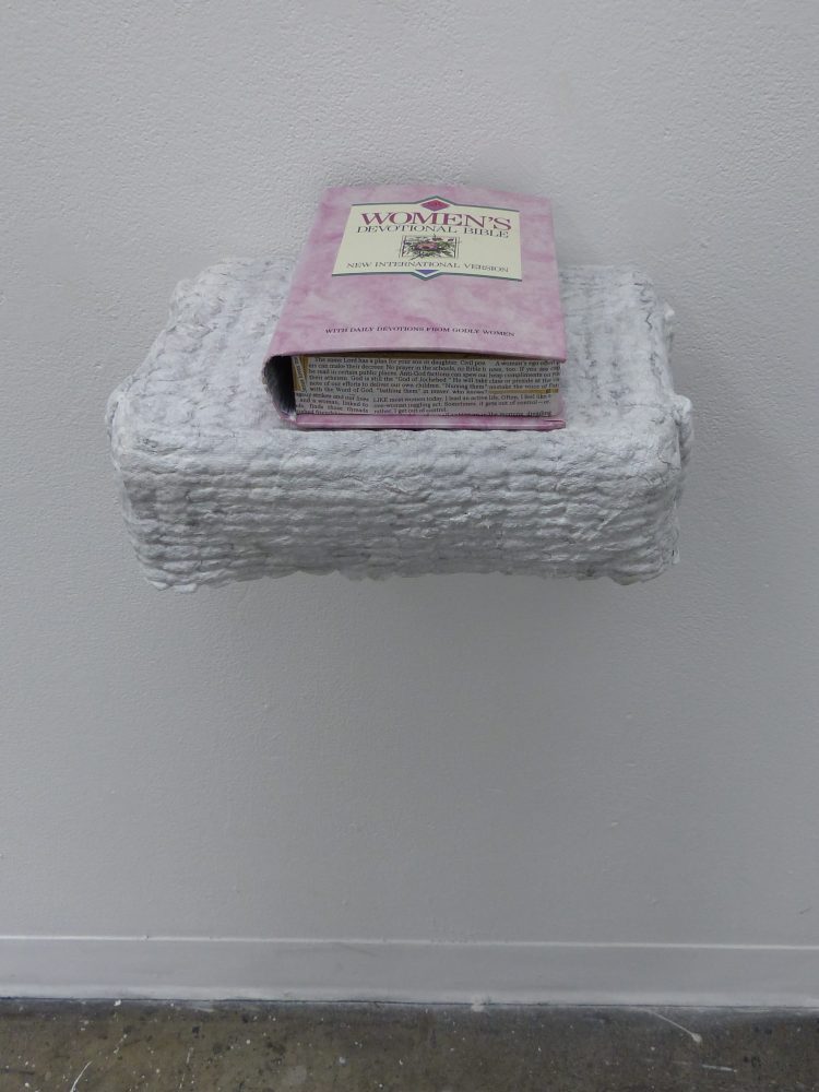 NIV Women’s Devotional Bible, pulped bible, ribbon, found objects, acrylic paint.